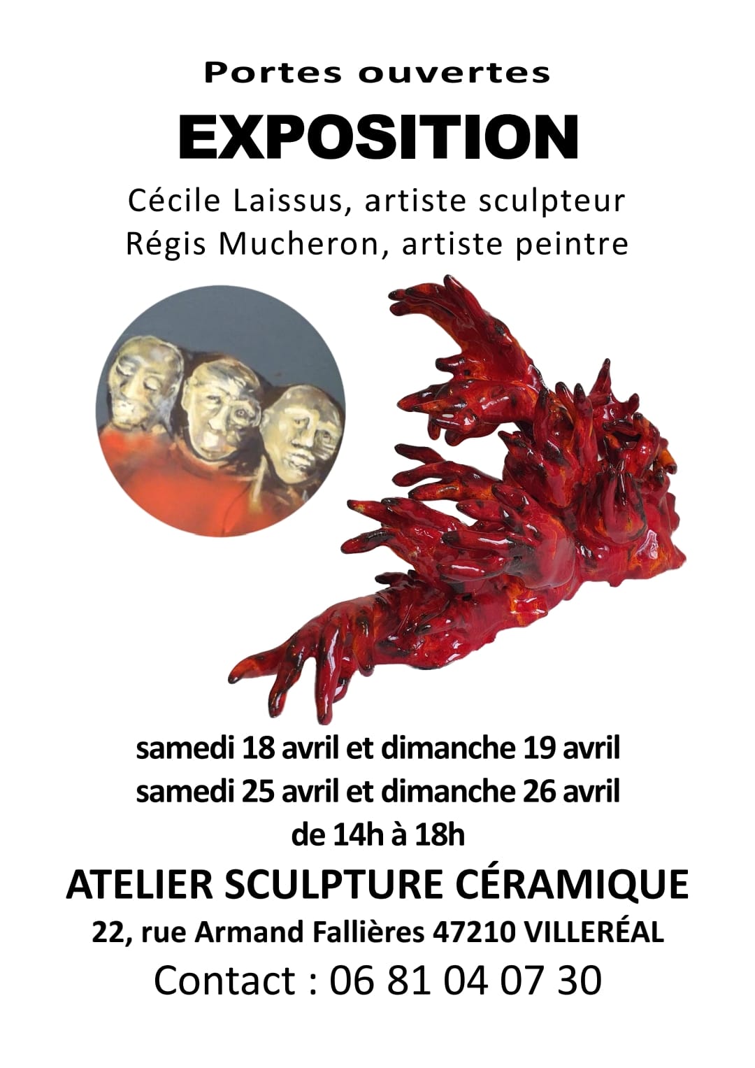 Cécile Laissus, artiste sculpteur, et Régis Mucheron, artiste peintre, ouvriront les portes de leur atelier du 22 rue Armand-Fallières, lors d'une exposition qui se tiendra les 18 et 19 avril ainsi que les 25 et 26 avril, de 14h à 18h.
