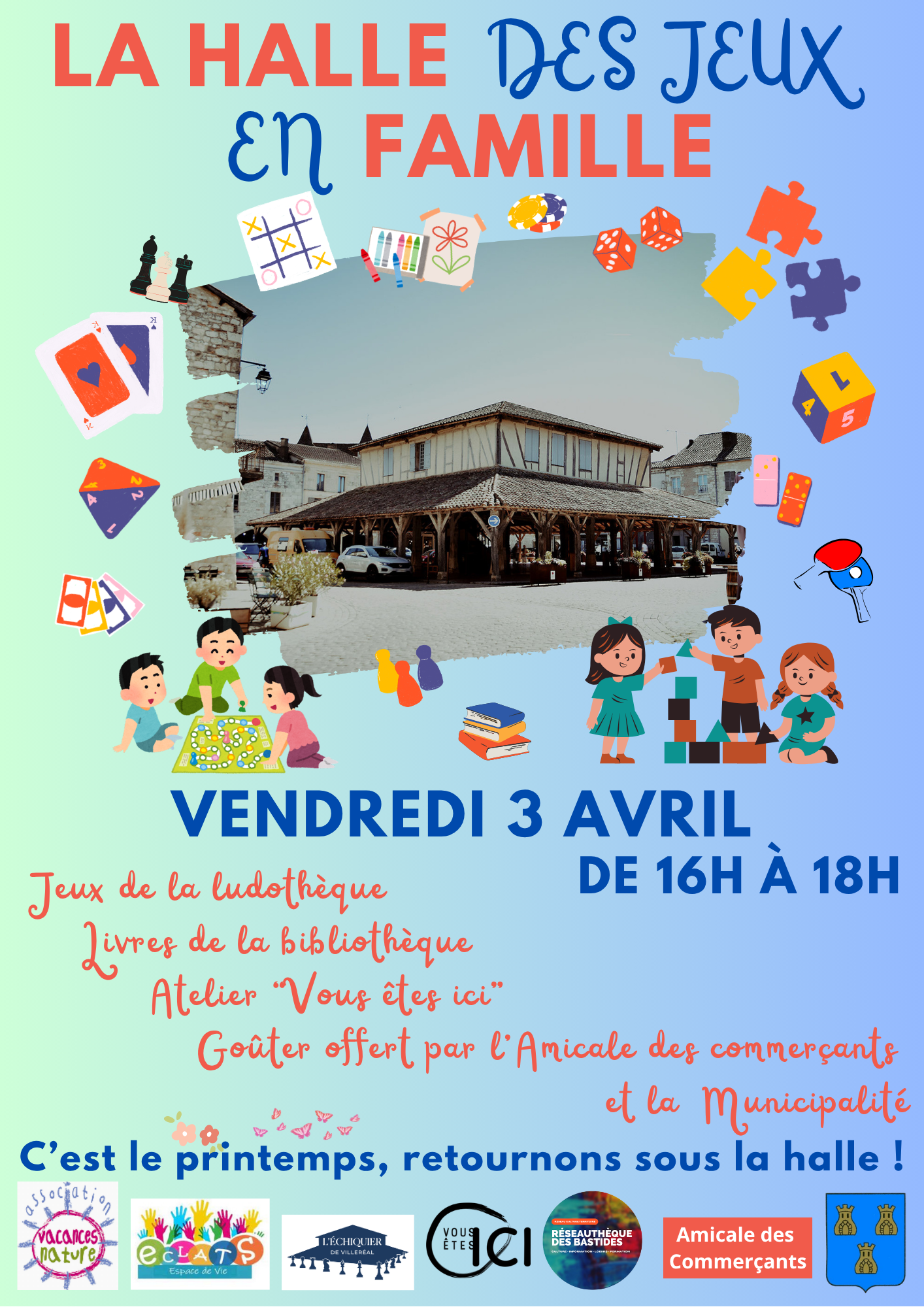 Pour fêter l'arrivée des vacances de Pâques, Vacances Nature - via la Ludothèque du Centre Social ECLATS - invite enfants et familles à passer un moment convivial sous la halle, ce vendredi 3 avril à l'heure de la sortie !