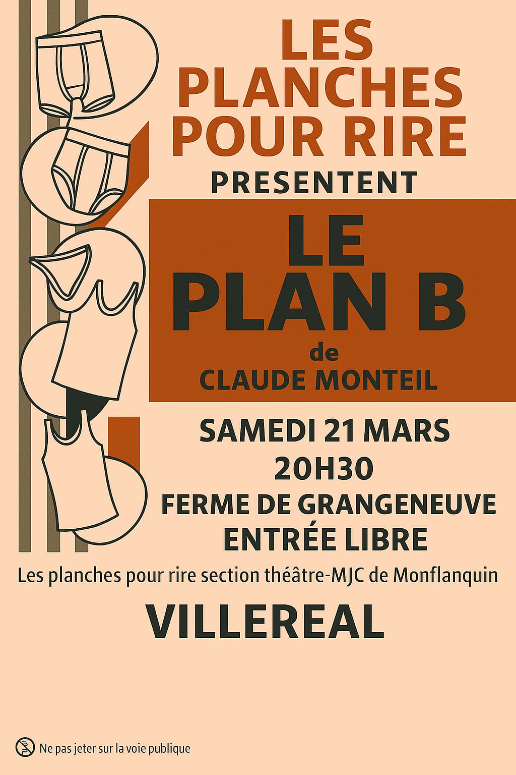 Samedi 21 mars à 20h dans la ferme de Grangeneuve à Villeréal, "PLAN B", comédie jouée par la troupe théâtrale de la MJC de Monflanquin, "LES PLANCHES POUR RIRE".